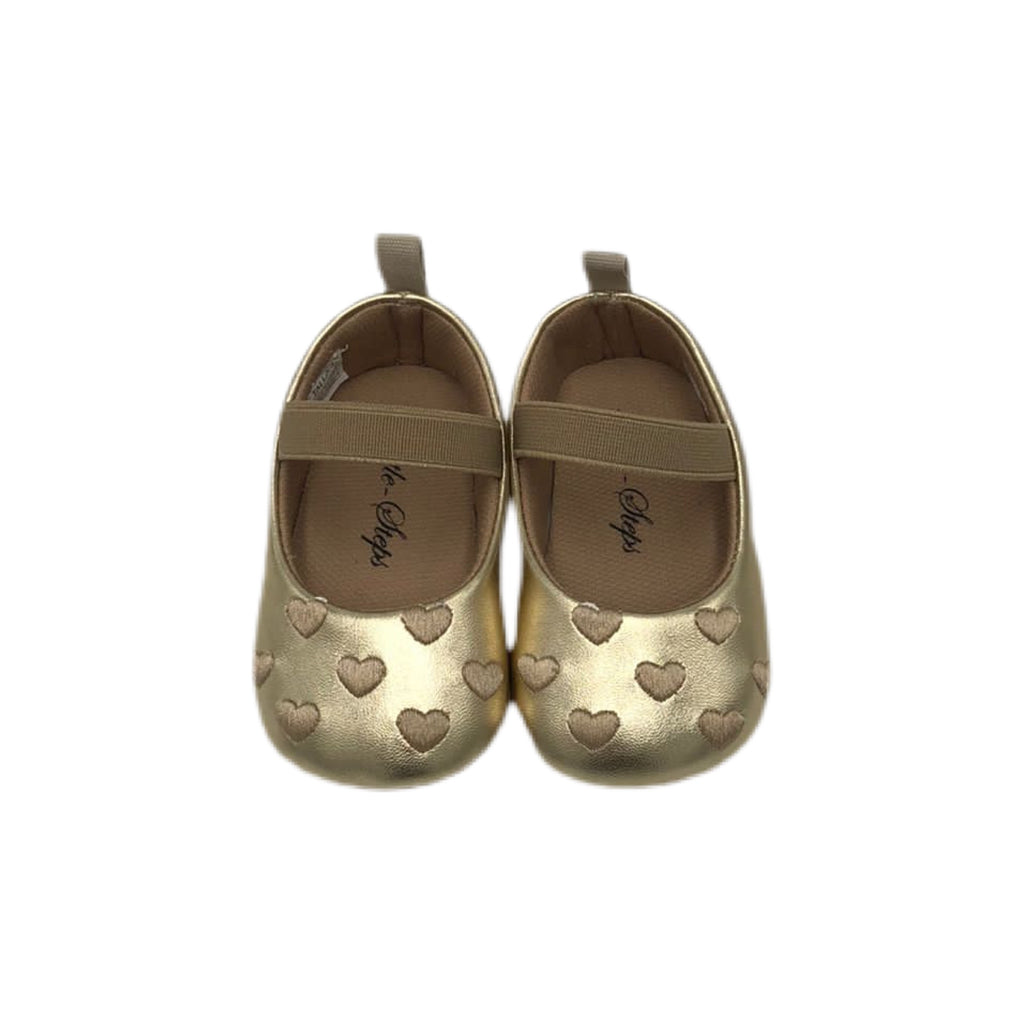 Zapato para bebe niña con adorno de corazones. Material de piel en color dorado. Traba elastica.