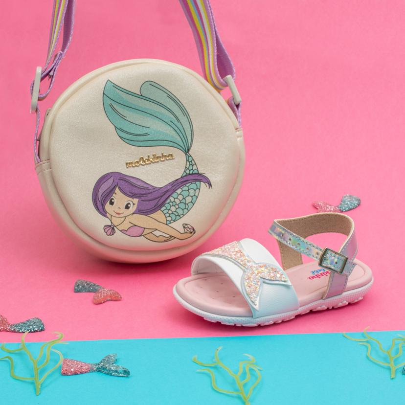 Sandalia para niña en color blanca con adorno de cola de sirena en glitter. Traba ajustable con broche. Suela antiderrapante. Plantilla ultra confort.