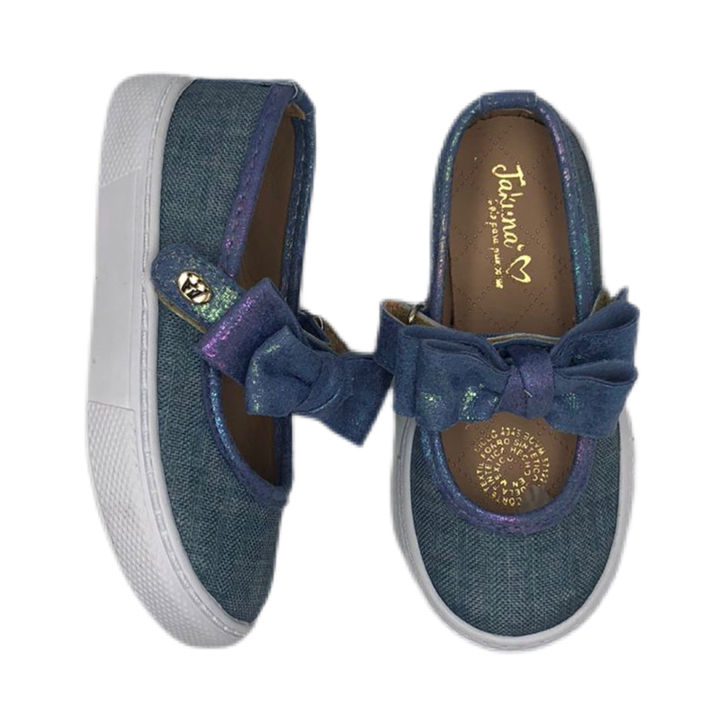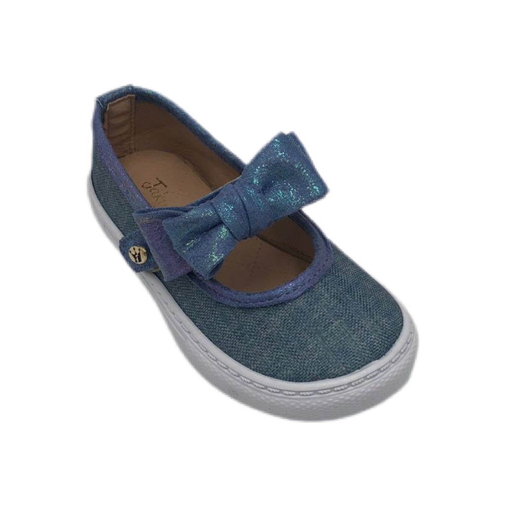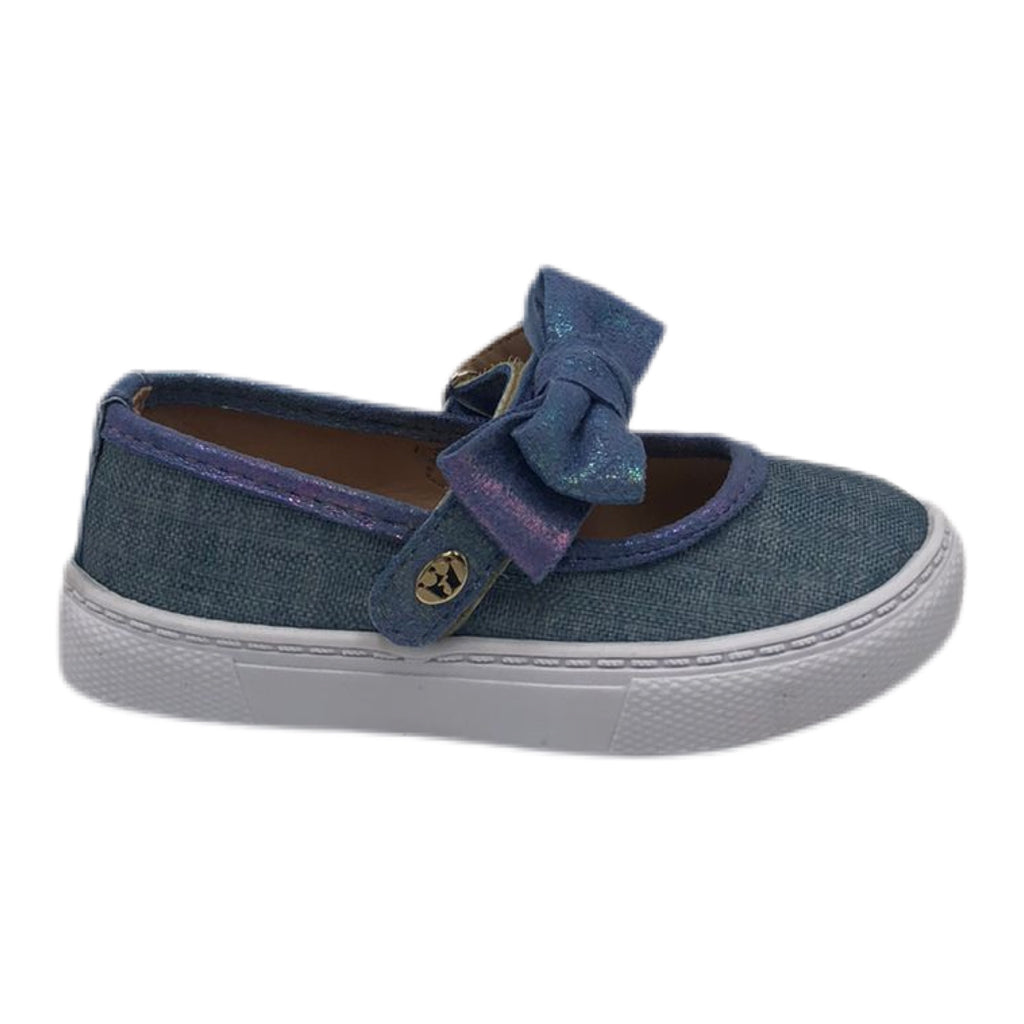 Zapato tipo tenis de niña. Muy ligero y de tela curri muy fácil de lavar. Suela de goma. Cierre de velcro. Detalle de moño.