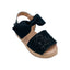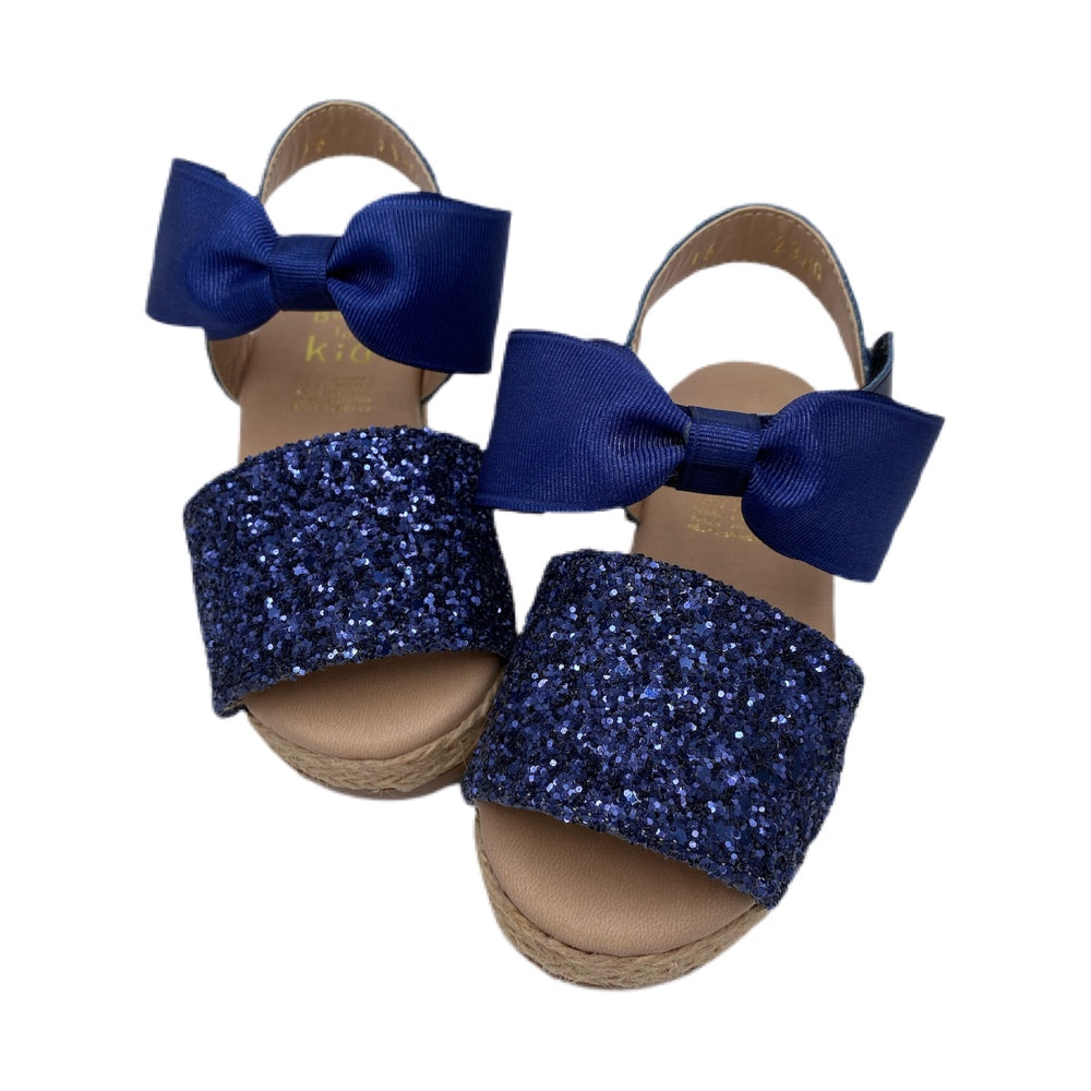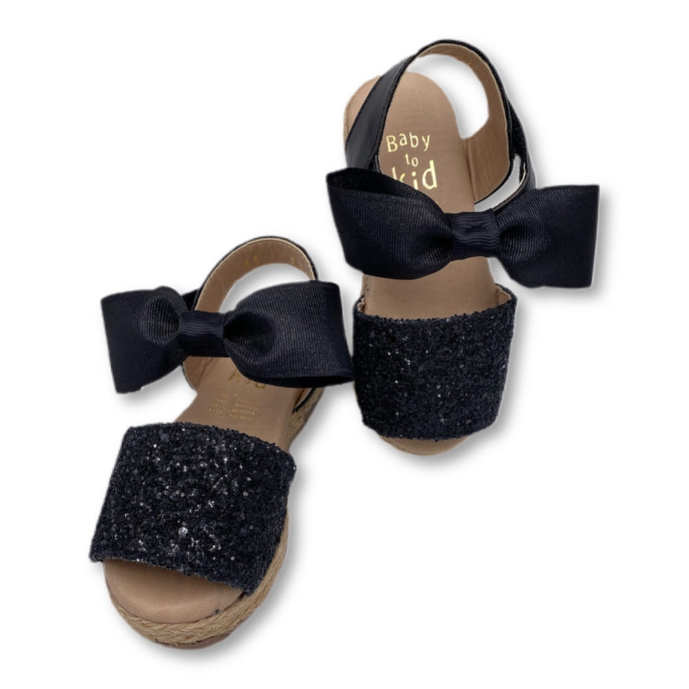 Sandalia que cierra con traba de velcro. Modelo de brillos en diferentes colores. Plataforma de yute. Suela de goma. Adorno de moño.