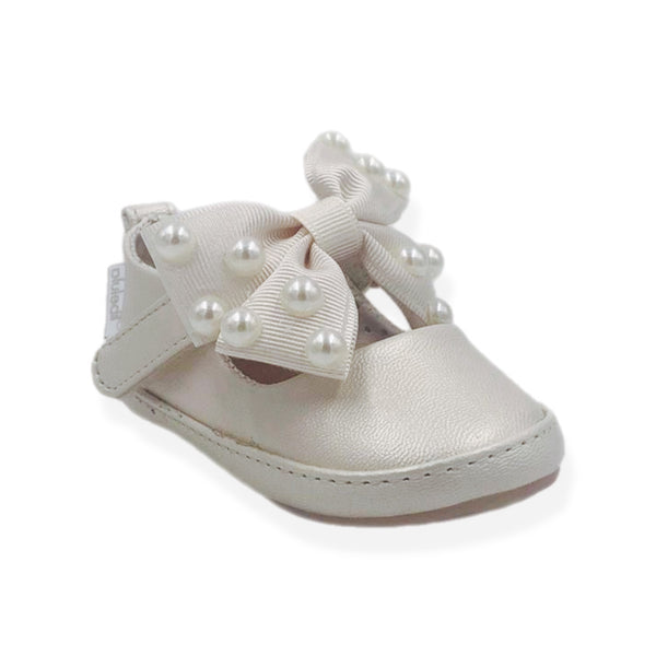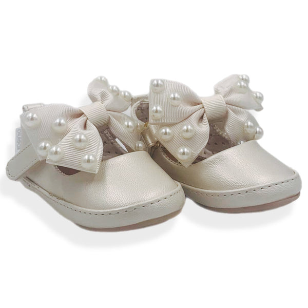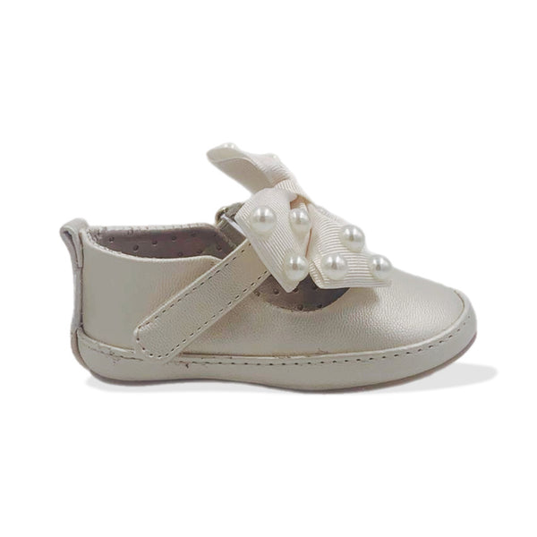 Dale a tu niña un toque de elegancia con la balerina Fancy Ivory, diseñada con un hermoso adorno de perlas en el moño y un práctico cierre de velcro para un ajuste perfecto. ✨